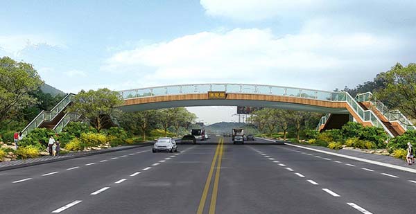 天橋位于旅游路千佛山南門入口與黃石崖路口之間,方便兩個(gè)景區(qū)之間的連接,天橋南北橫跨旅游路,天橋全長(zhǎng)41米,寬4.5米,共1跨,上部結(jié)構(gòu)為等截面鋼梁,橋梁全長(zhǎng)為41米,梁高1.3米。天橋造型簡(jiǎn)潔明了,曲線優(yōu)美,自然的融入到千佛山景區(qū)中,與周圍景色渾然一體。工程造價(jià)700萬(wàn)元,于2013年11月投入使用。
